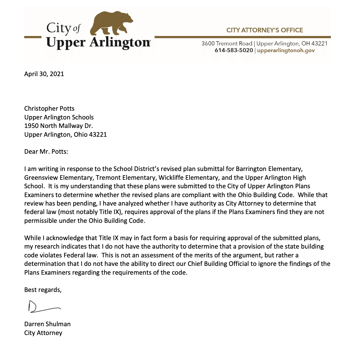 Darren Shulman, city attorney, responded to the letter acknowledging that Title IX may “form a basis for requiring approval,” but that the city does “not have the authority to determine that a provision of the state building code violates Federal law.”