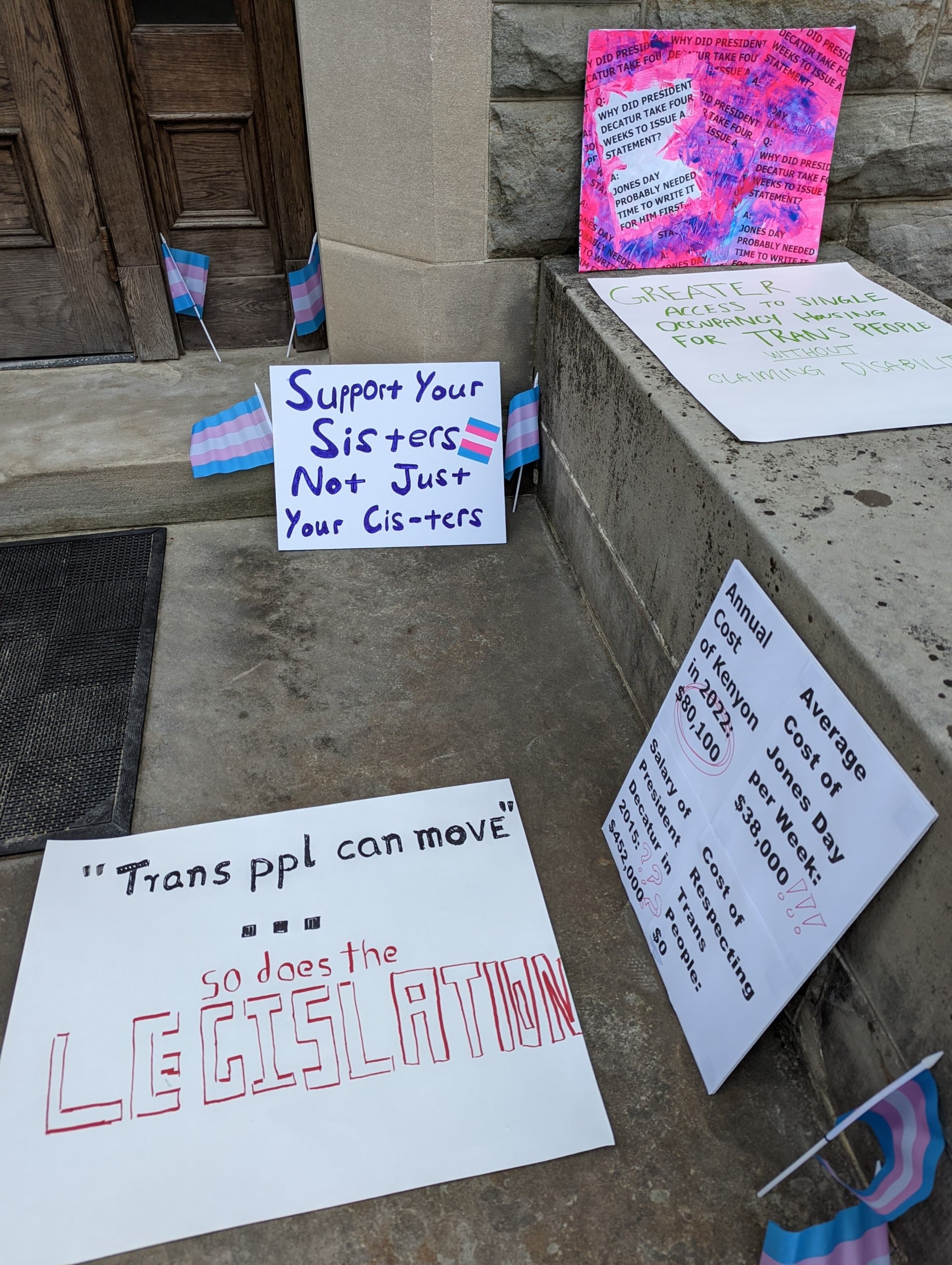On March 2nd, Kenyon students held a campus community conversation entitled, “Transmisogyny & Effective Allyship,” after which the students delivered the following demands (via protest signs) to the Office of the Kenyon President.