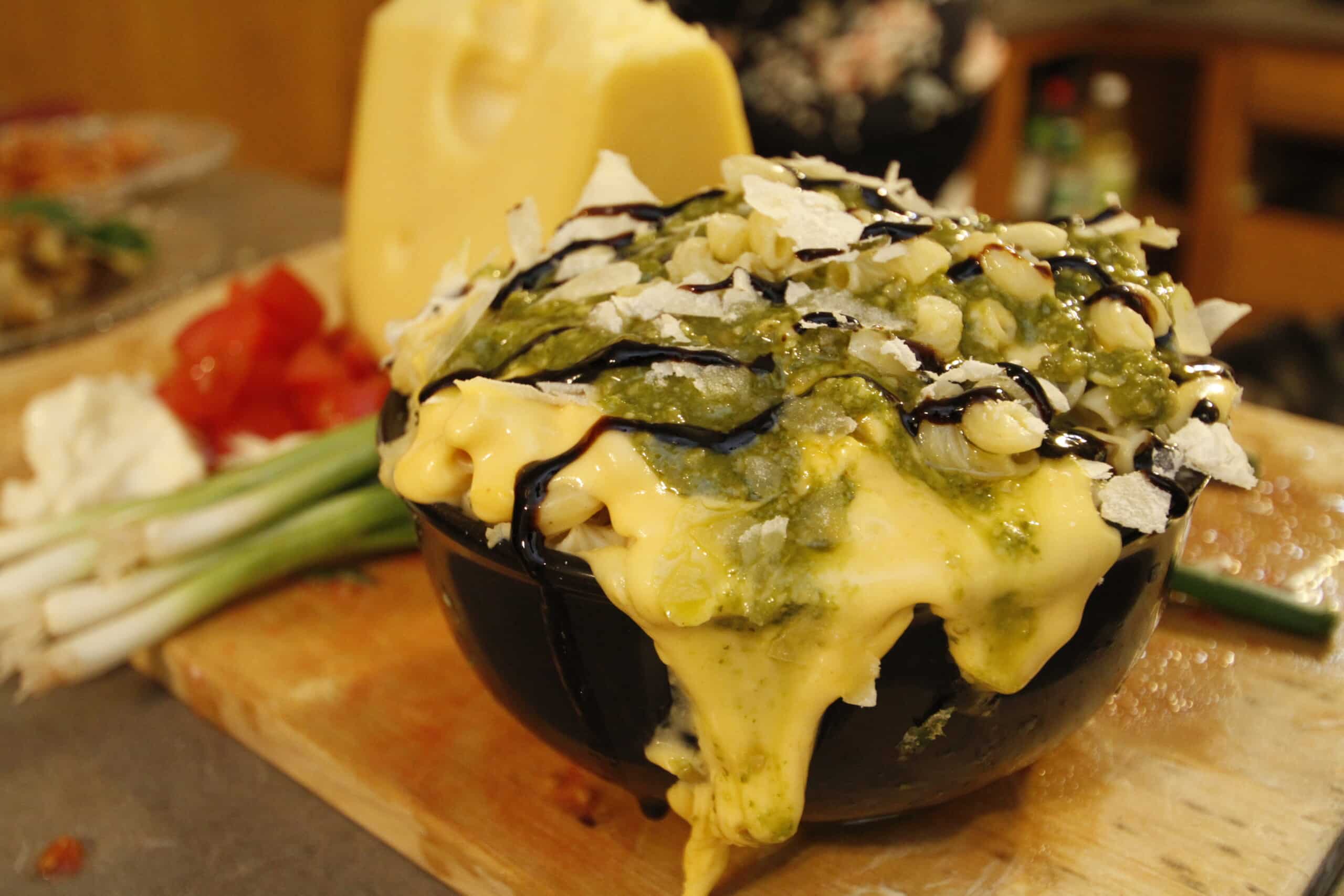 - Pesto Both Worlds – Classic mac n’ cheese paired with bold pesto, parmesan cheese, and drizzled with balsamic glaze.