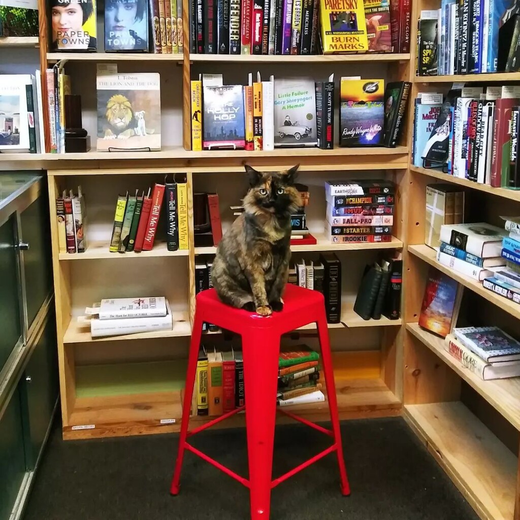 Near the front door at The Bookshop in Lakewood, a tortoiseshell cat named Hobbes is fast asleep above the cash register.