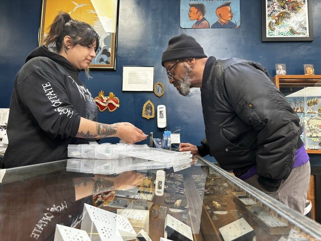 At Skincraft, an LGBTQ+ friendly piercing and tattoo shop in Northside, Ron browses a glass case for new jewelry.