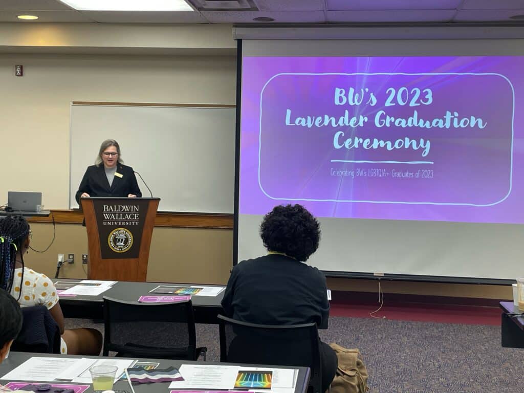 Baldwin Wallace University in Berea held their Lavender Graduation Ceremony on April 20. The keynote address was delivered by Dr. Emilia Lombardi, associate professor and chair of the Department of Public Health and Prevention Science. Dr. Lombardi has been involved in HIV prevention research and examining health disparities among racial and ethnic, sexual and gender minorities for more than 15 years.