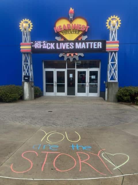 Outside, Angels in Action – a grassroots effort to support drag story hours across Northeast Ohio – decorated the pavement around the theatre with supportive and colorful messages.