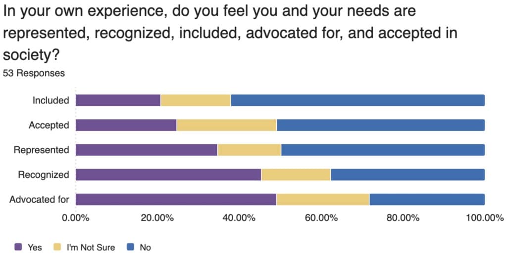 Self-esteem emerged as the leading challenge, with 64% of 167 respondents who have faced substance abuse or addiction identifying it as a top issue. This was followed by difficulties with planning for the future and setting goals, reported by 52%. Additionally, experiences of discrimination remain widespread: of 180 respondents, 78% have faced discrimination in public spaces, while 58% have encountered it in the workplace.