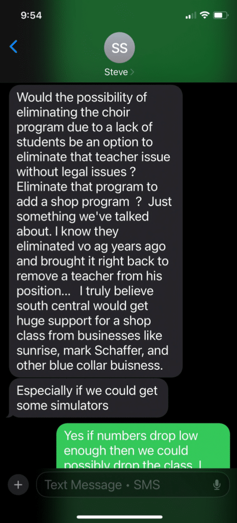 According to records obtained by The Buckeye Flame through an open records request, Steve S. sent Board Member John Whitright a text suggesting that the Board of Education eliminate the choir program to “eliminate that teacher issue without legal issues.”