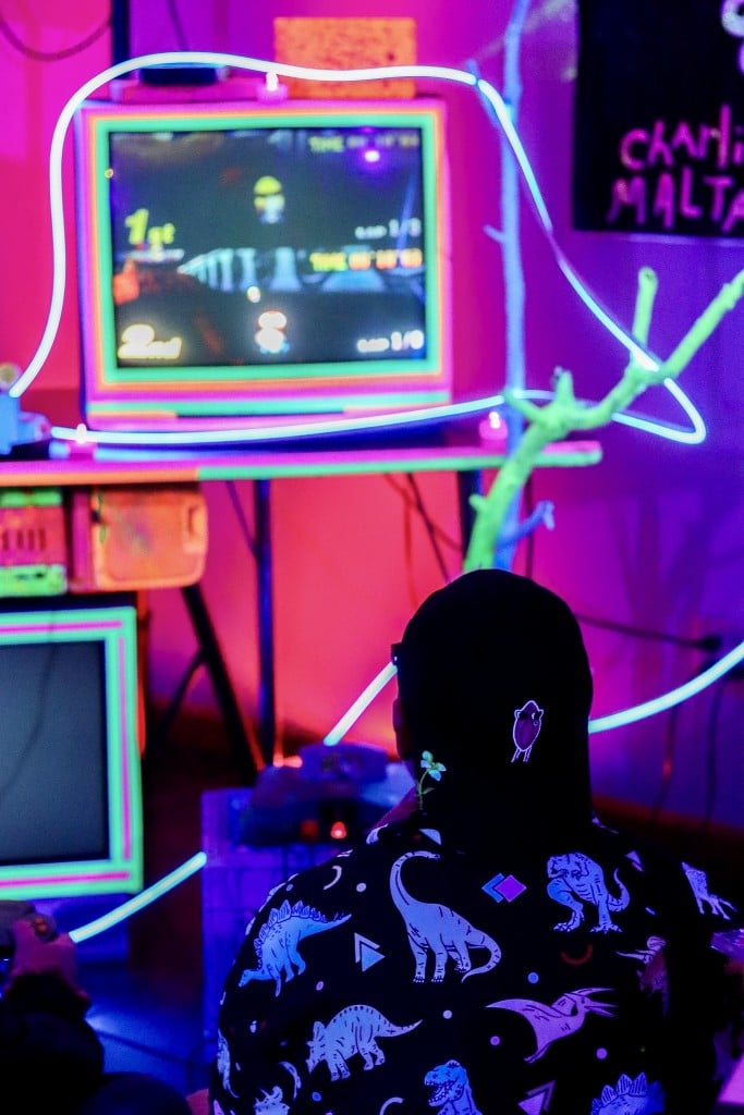 “We do a lot of glow-in-the-dark, a lot of little mini sets, a lot of immersive and interactive activities. One of our big signatures is that I have a huge retro and vintage collection,” she said. “I have boomboxes, record players, TVs and we build art installations with them where we stack them and wrap toys around them.”