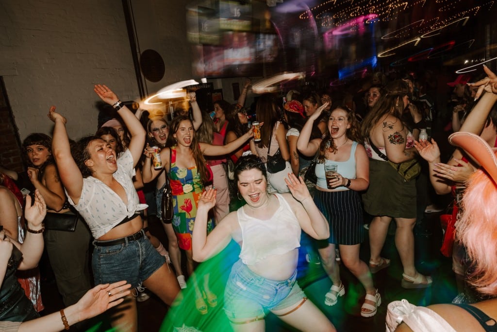 Featuring DJ Nymph, and a “Sappho’s Disco” theme, Dunkley’s photos capture dozens of queer people dancing and laughing.